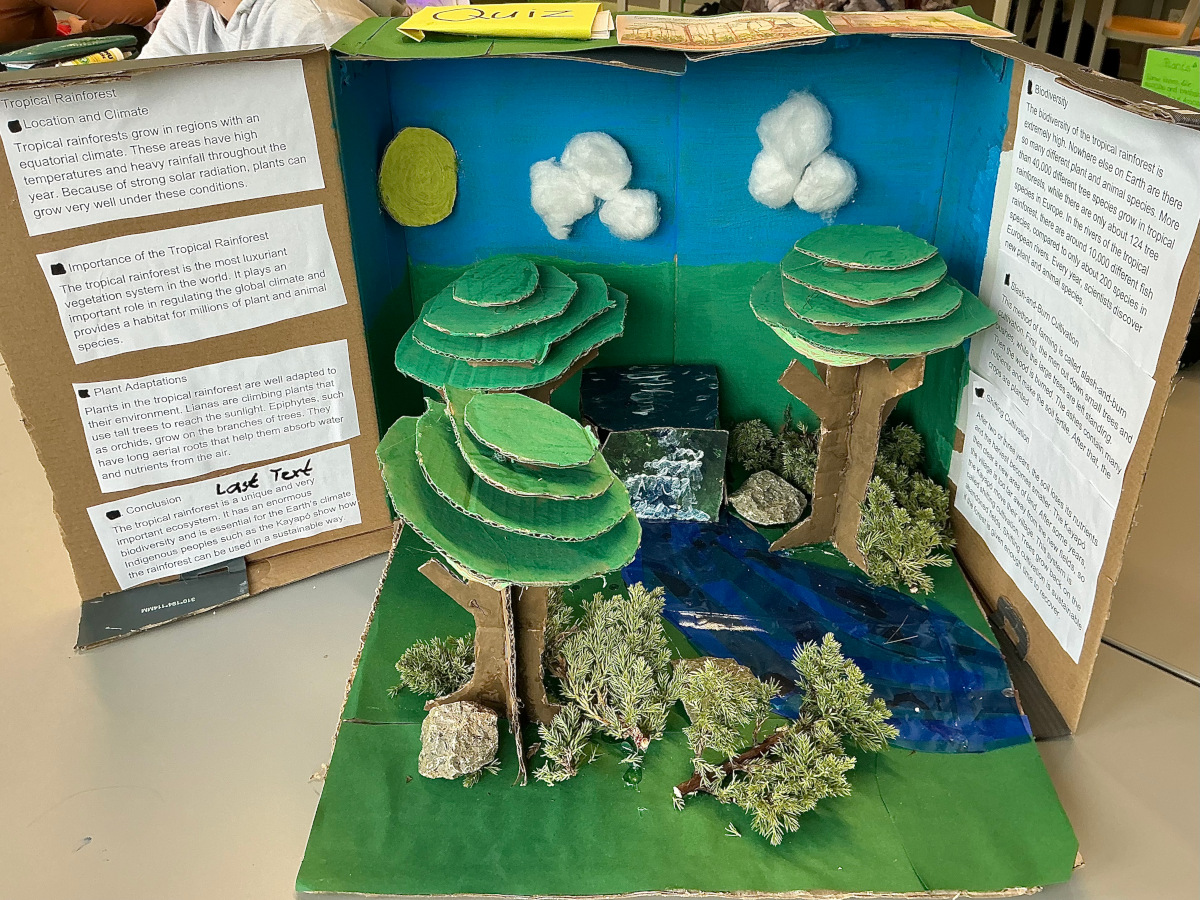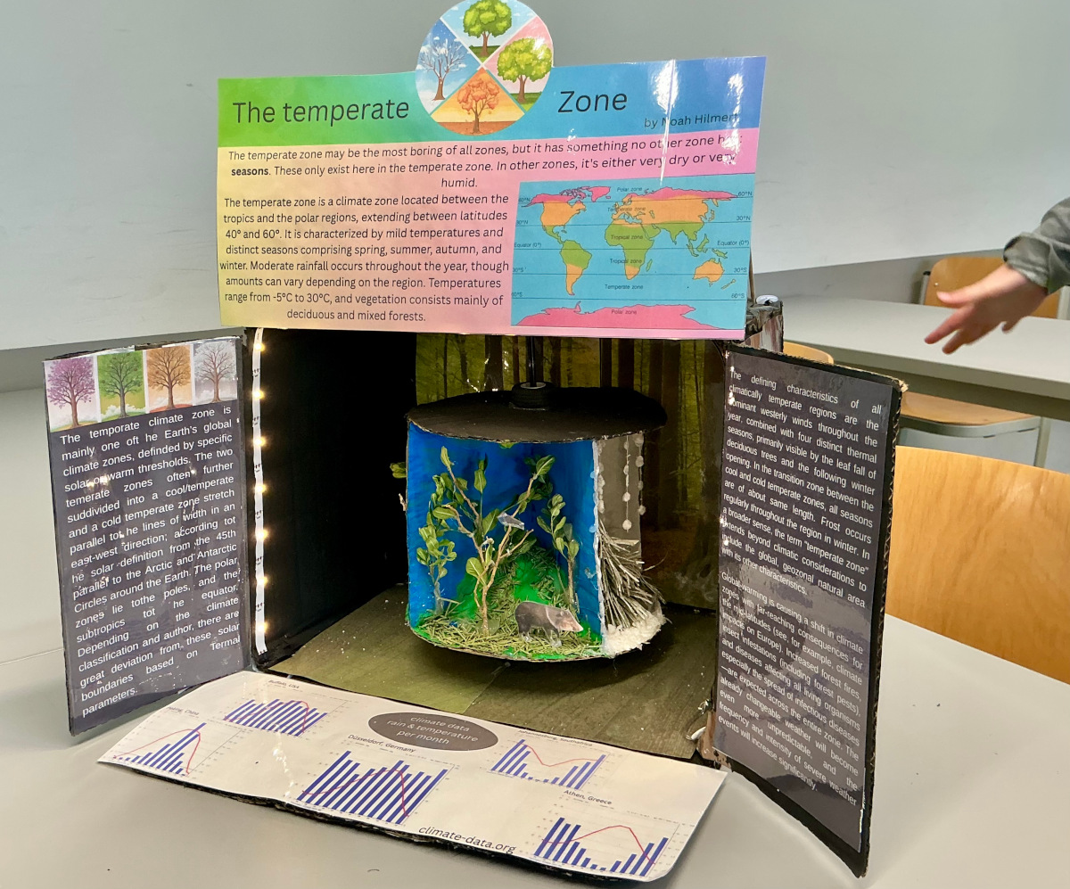 Die Erde ist ein vielfältiger Planet mit unterschiedlichsten Klimazonen, die jeweils ganz eigene Landschaften, Pflanzen und Tiere hervorbringen und bestimmte Effekte für das Leben von Tieren und Menschen in jeder Zone haben. Diese komplexen Zusammenhänge lassen sich mit Hilfe von selbstgebastelteten Modellen anschaulich nachvollziehen. Die diesjährigen Bili-7er haben im November und Dezember unter Frau Röhnes Anleitung solche Modelle gebaut und kurz vor Weihnachten in einem "gallery walk" erkundet und ausgewertet.