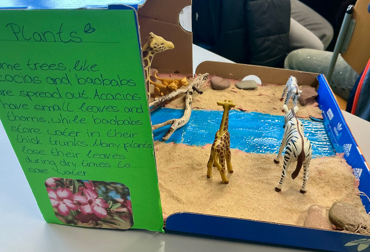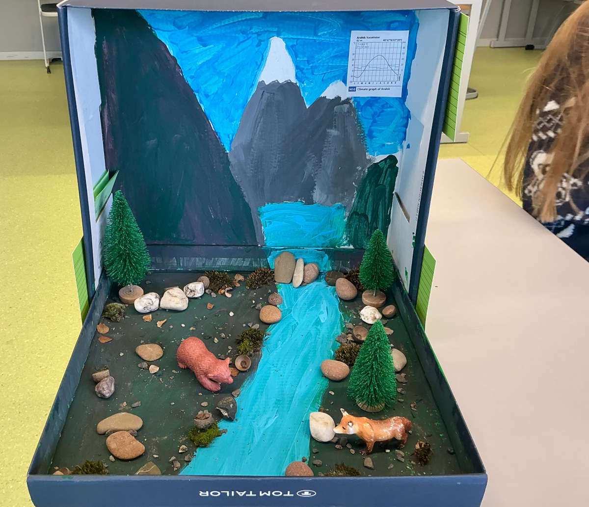 Nach einer umfassenden Recherchephase und ersten Skizzen und Überlegungen bezüglich benötigter Materialien wurden Schuhkartons besorgt und für die Kleingruppenprojekte hergerichtet. Dafür wurden Naturalien wie Sand, Holz und Steine gesammelt sowie Bäume, Gewässer, Eis und Wüste mit viel Klebepistoleneinsatz, dem Anrühren des "perfekten" Brauntons und dem gelegentlichen motivierenden Griff in die Glitzerdose sorgfältig konstruiert.