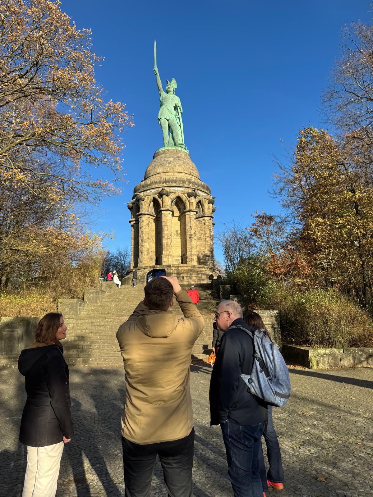 Für die Schüler*innen war der Donnerstag dann etwas kürzer, denn es stand "nur" eine Stadtführung in Detmold auf dem Programm. Diese führte die Gruppe an verschiedene Orte in Detmold, die mittelbar oder unmittelbar mit der Entwicklung der Meinungsfreiheit in Deutschland bzw. dem Fürstensitz in Lippe zu tun hatten. Dabei wurde auch das erste Parlament in Lippe besucht, das heutige Landgericht. Während die Schüler*innen den freien Nachmittag genossen, besuchten die Lehrkräfte aus Norwegen unter fachkundiger Führung von Frau Wahren noch das Hermannsdenkmal.