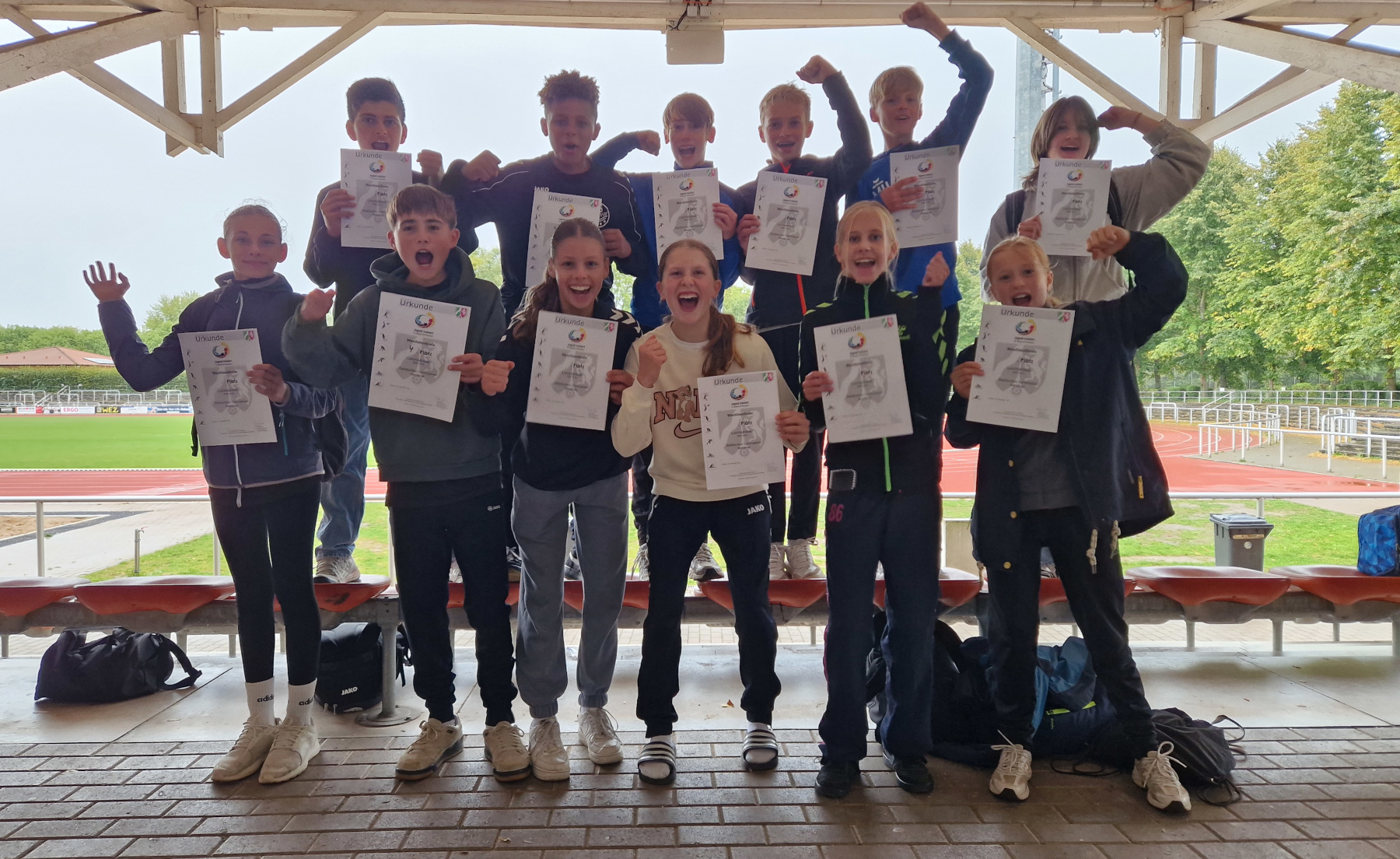Das große Landesfinale fand am 16. September 2025 im Weserstadion in Minden statt – ein besonderer Höhepunkt für unser junges Team. In dieser Altersklasse stehen nicht Einzelergebnisse, sondern die Vielseitigkeit und der Teamgedanke im Mittelpunkt. Die Disziplinen – 50-Meter-Hindernis-Sprintstaffel, Heuler-Wurf, Medizinballstoß, Hochsprung (Schersprung), Zonenweitsprung und ein 8-Minuten-Lauf – wurden von allen 12 Teammitgleidern gemeinsam absolviert.